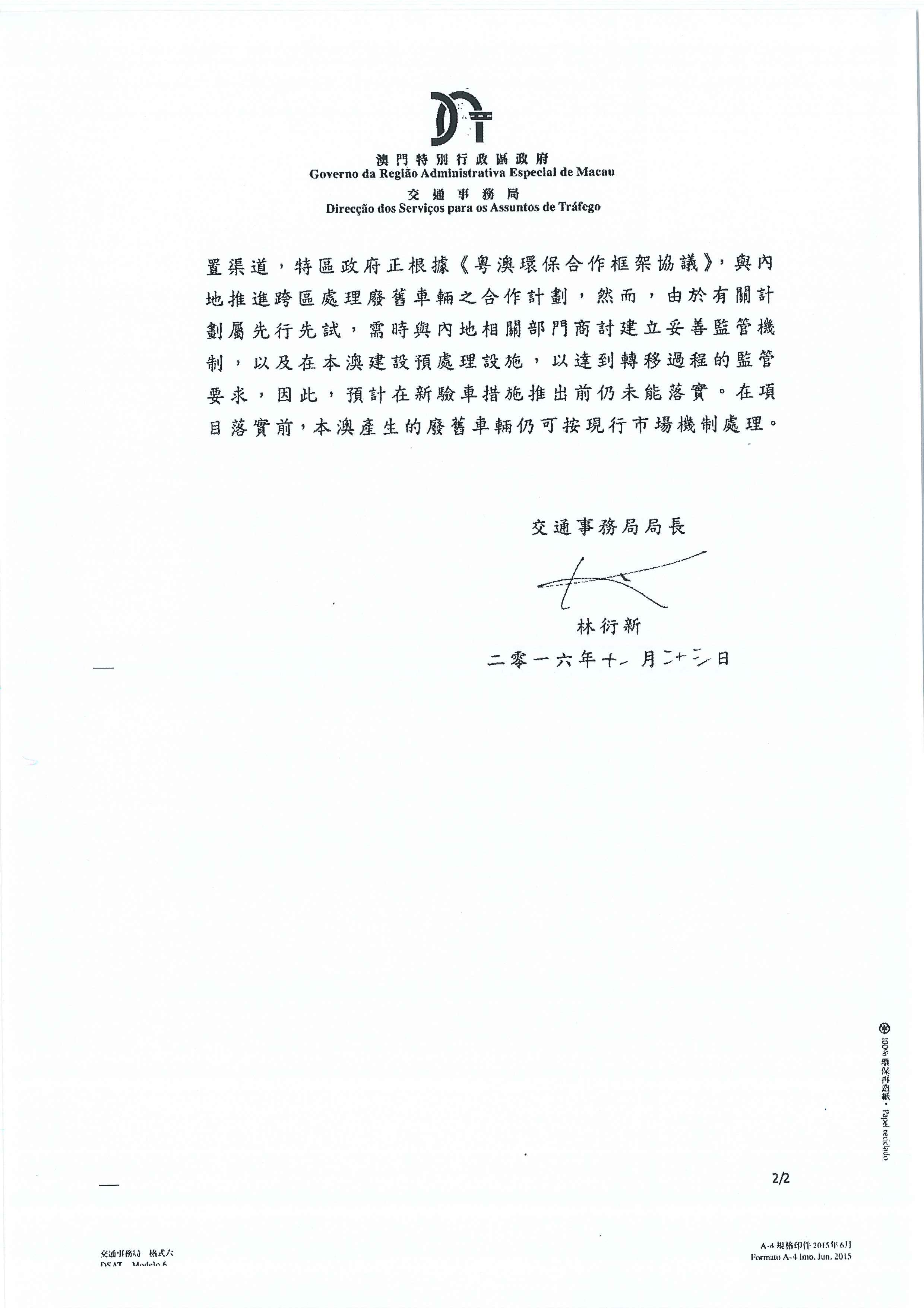 2016.11.23書面質詢回覆—關注未來車輛報廢與檢驗的配套 wmss | 2016 年 11 月 23 日 | 書面質詢回覆, 第五屆立法會黃潔貞, 議政論政 | 尚無留言 Tags:交通道路, 婦聯, 立法會, 黃潔貞 Related Posts 2015.05.21 黃潔貞促解決水浸問題 尚無留言 | 5 月 21, 2015 2017.05.09 黃潔貞:營造兩性平等氛圍 尚無留言 | 5 月 9, 2017 2014.07.18 書面質詢—促將新生兒聽力篩查納入兒童保健計劃 尚無留言 | 7 月 18, 2014 2016.11.04 黃潔貞冀提升托兒服務質素 尚無留言 | 11 月 4, 2016 About The Author 黃潔貞