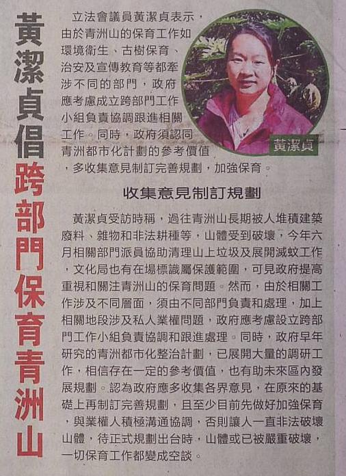 收集意見制訂規劃黃潔貞受訪時稱,過往青洲山長期被人堆積建築廢料、雜物和非法耕種等,山體受到破壞,今年六月相關部門派員協助清理山上垃圾及展開滅蚊工作,文化局也有在場標識屬保護範圍,可見政府提高重視和關注青洲山的保育問題。然而,由於相關工作涉及不同層面,須由不同部門負責和處理,加上相關地段涉及私人業權問題,政府應考慮設立跨部門工作小組負責協調和跟進處理。同時,政府早年研究的青洲都市化整治計劃,已展開大量的調研工作,相信存在一定的參考價值,也有助未來區內發展規劃。認為政府應多收集各界意見,在原來的基礎上再制訂完善規劃,且至少目前先做好加強保育,與業權人積極溝通協調,否則讓人一直非法破壞山體,待正式規劃出台時,山體或已被嚴重破壞,一切保育工作都變成空談。