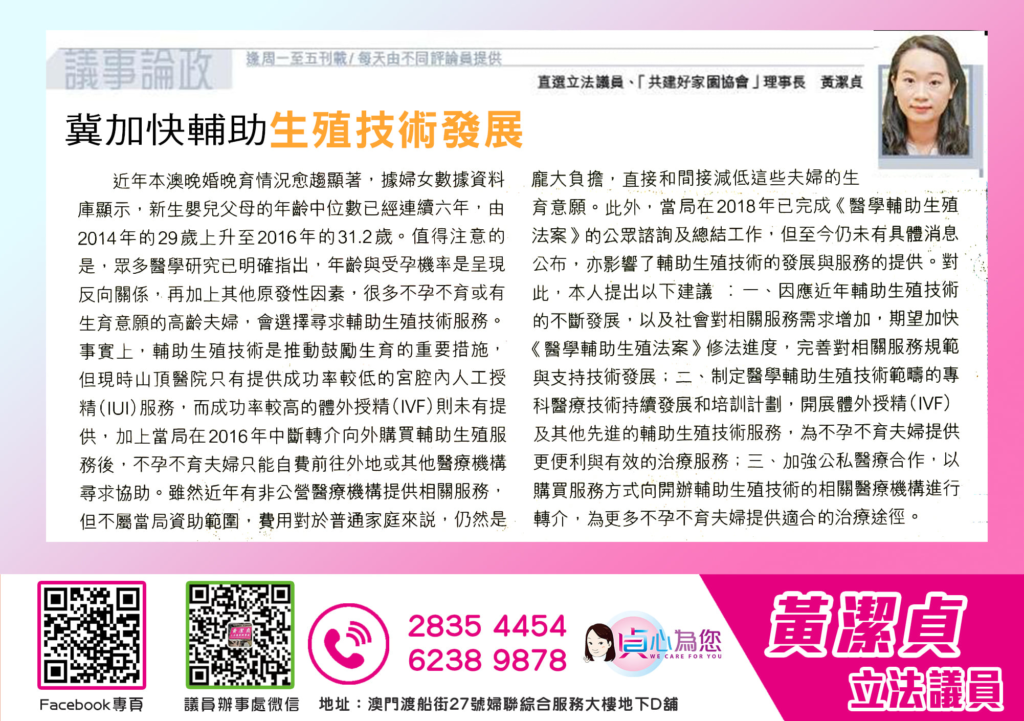 對此,本人提出以下建議︰一、因應近年輔助生殖技術的不斷發展,以及社會對相關服務需求增加,期望加快《醫學輔助生殖法案》修法進度,完善對相關服務規範與支持技術發展;二、制定醫學輔助生殖技術範疇的專科醫療技術持續發展和培訓計劃,開展體外授精(IVF)及其他先進的輔助生殖技術服務,為不孕不育夫婦提供更便利與有效的治療服務;三、加強公私醫療合作,以購買服務方式向開辦輔助生殖技術的相關醫療機構進行轉介,為更多不孕不育夫婦提供適合的治療途徑。