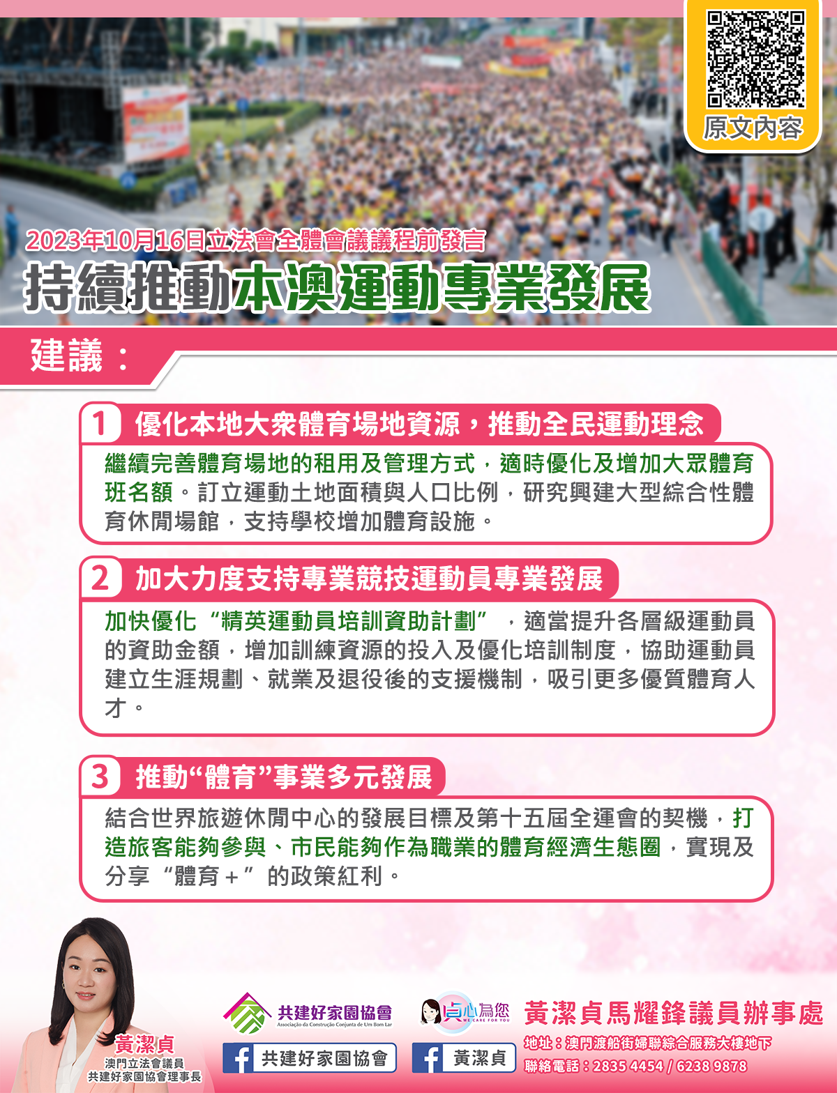為此,本人提出以下建議: 1.優化本地大眾體育場地資源,推動全民運動理念。面對體育場地不足,限制了市民參與不同運動活動的情況;為了平 衡公眾使用場地,近月當局調整了部分游泳池的開放方式及大眾體育班的報名安排。為此,建議平衡大眾體育與專業體育訓練的需求,持續完善體育場地的租用及管理方式,以及爭取更多具備條件的學校、機構等體育場館設施向公眾開放,為一般市民租用體育場地提供便利和保障;並持續評估調整體育場地開放方式及大眾體育班的成效,適時再作優化及增加名額。長遠從規劃層面出發,訂定運動土地面積與人口的比例,乃至制定各區份和不同種類運動項目的場地數量和規劃,避免大眾體育、競技體育及“體育+”所需的場地過度重疉。同時,繼續研究在合適地段興建大型綜合性體育休 閒場館及支持學校增加體育設施,滿足市民及青年學生的運動需要。 2. 加大力度支持專業競技運動員專業發展。建議當局儘快落實優化“精英運動員培訓資助計劃”,適當提升各層級運動員的資助金額。同時,增加訓練資源的投入及優化培訓制度,持續完善運動員選拔機制、培訓中心設施建設及增加出外集訓機會;協助運動員建立生涯規劃,為運動員訂定學業,就業及退役後的支援機制,讓他們可以在黃金時期無後顧之憂地投身體育事業,以吸引更多具潛力的本澳市民,投身專業運動員的行列。 3. 推動“體育”事業多元發展。現時“體育+旅遊”主要是透過大型體育盛事,吸引旅客來澳,以體育項目帶來周邊經濟活動及收益。建議在現時舉辦大型體育盛事的基礎上,結合世界旅遊休閒中心的發展目標及第十五屆全運會的契機,打造旅客能夠參與,市民能夠作為職業的體育經濟生態圈,例如教練、裁判、場地維護,以至生產運動用品等,進一步開創“體育+”的可能性,讓體育運動在強健普羅大眾身體的同時,亦能帶來經濟收益,充分實現及分享“體育+”的政策紅利。