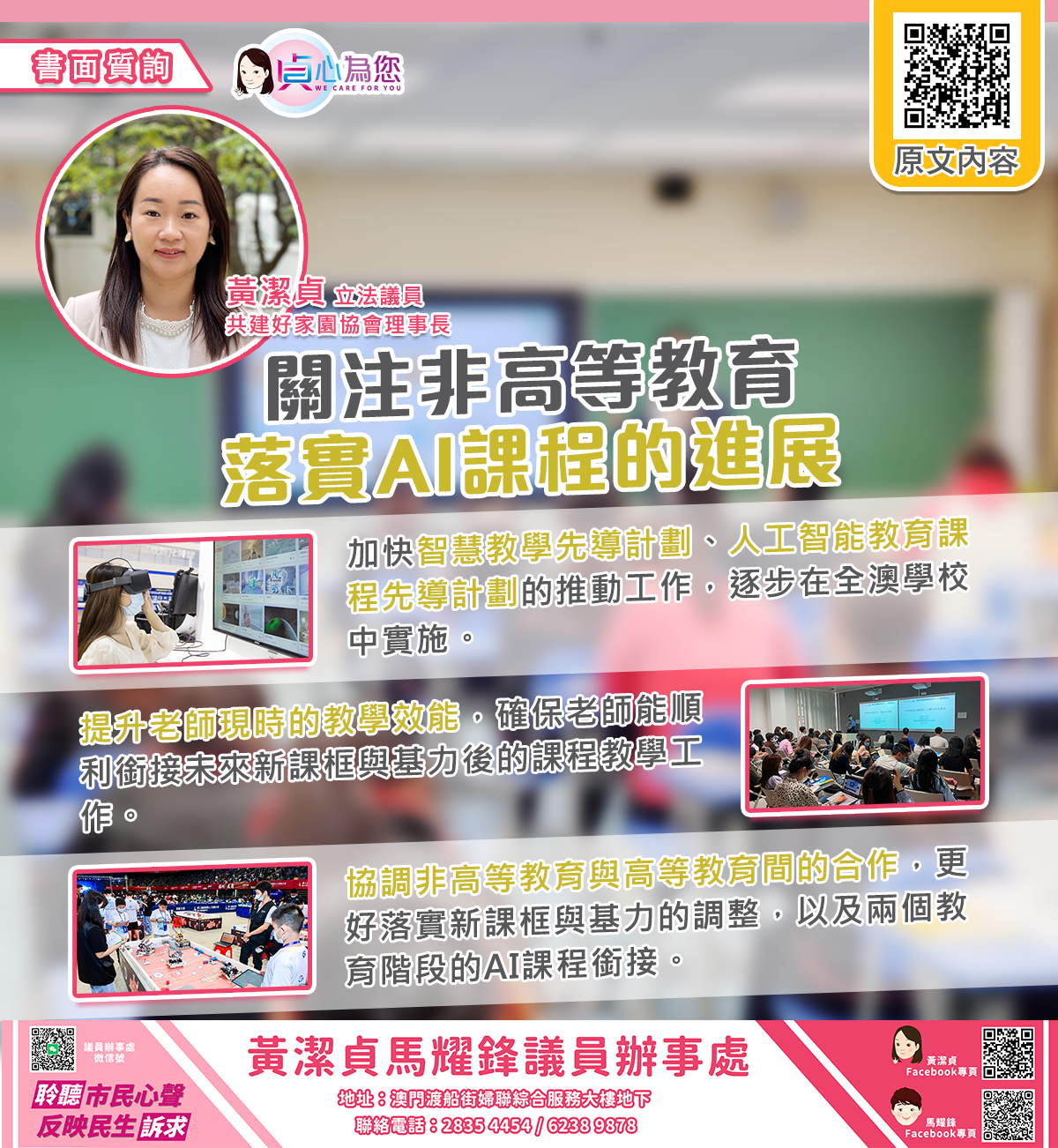 對此,本人提出以下質詢: 1.因應政府計劃二四/二五學年實施新課框與基力,並加快AI元素,當局如何加快智慧教學先導計劃、人工智能教育課程先導計劃的推動工作,逐步在全澳學校中實施?此外,當局去年也曾表示在智慧教學先導計劃後,將會開展AI教育的先導計劃,請問有關計劃的內容與進展如何? 2.為確保老師能順利銜接未來新課框與基力後的課程教學工作,提升老師教學效能,請問政府在老師的相關培訓計劃上,有何具體的支持? 3.對於發展AI教育上,本澳不少高校早有相關經驗,包括科系設置與產學研工作等,當局未來如何協調非高等教育與高等教育間的合作,藉此更好落實新課框與基力的調整,以及兩個教育階段的AI課程銜接?